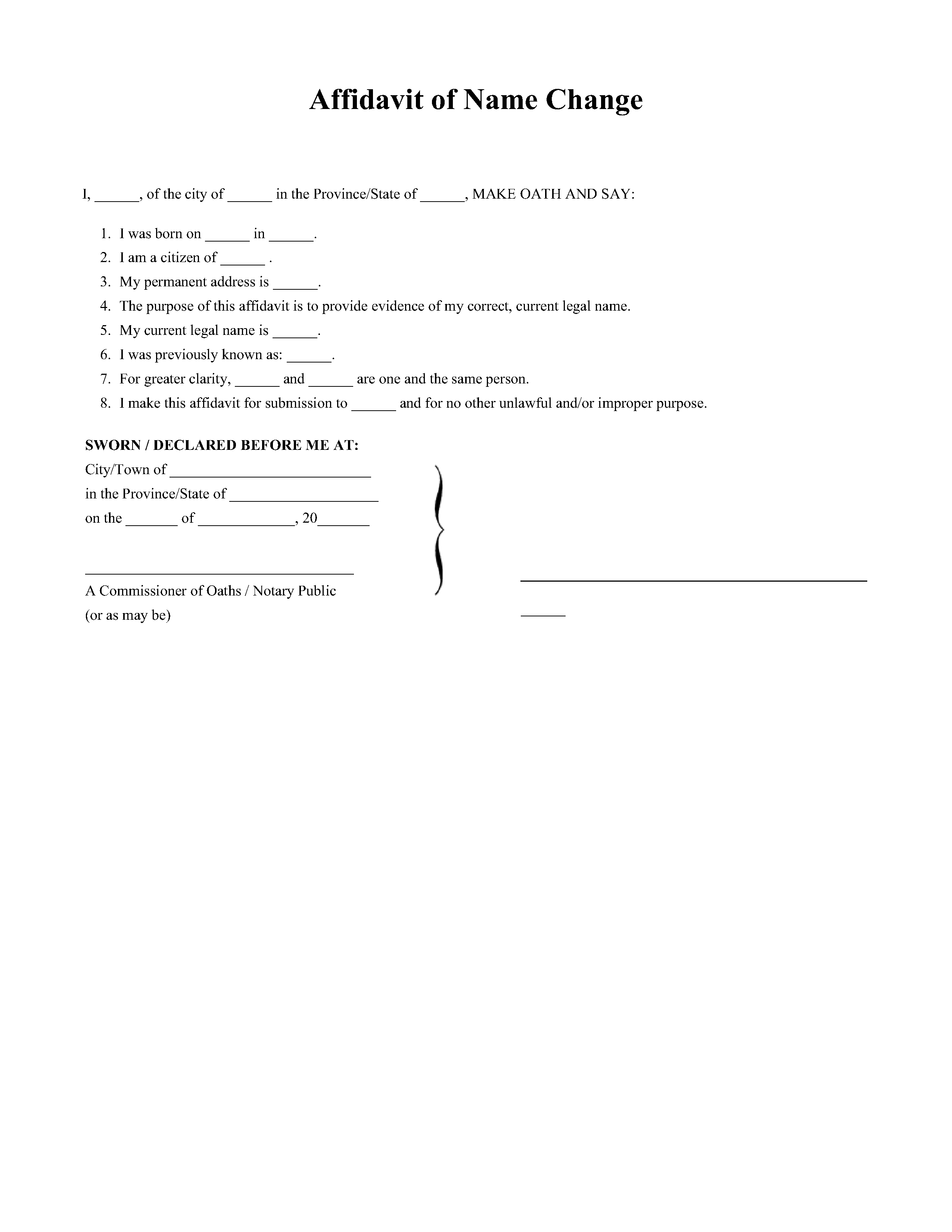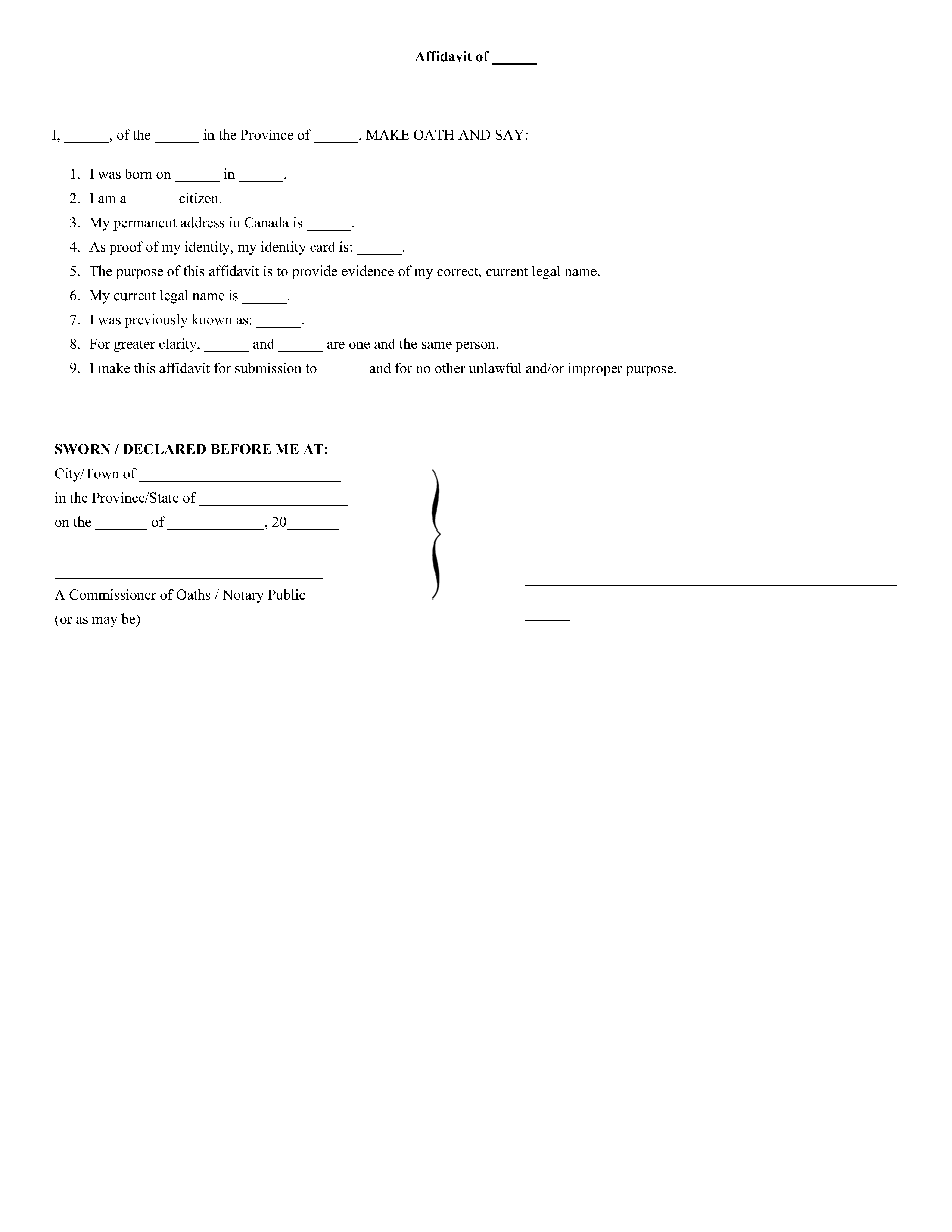 In Canada, an Affidavit of Name Change is a sworn document used to formally declare a name change. This Affidavit is typically needed when updating personal records or explaining a name change to government organizations, financial institutions, and schools.