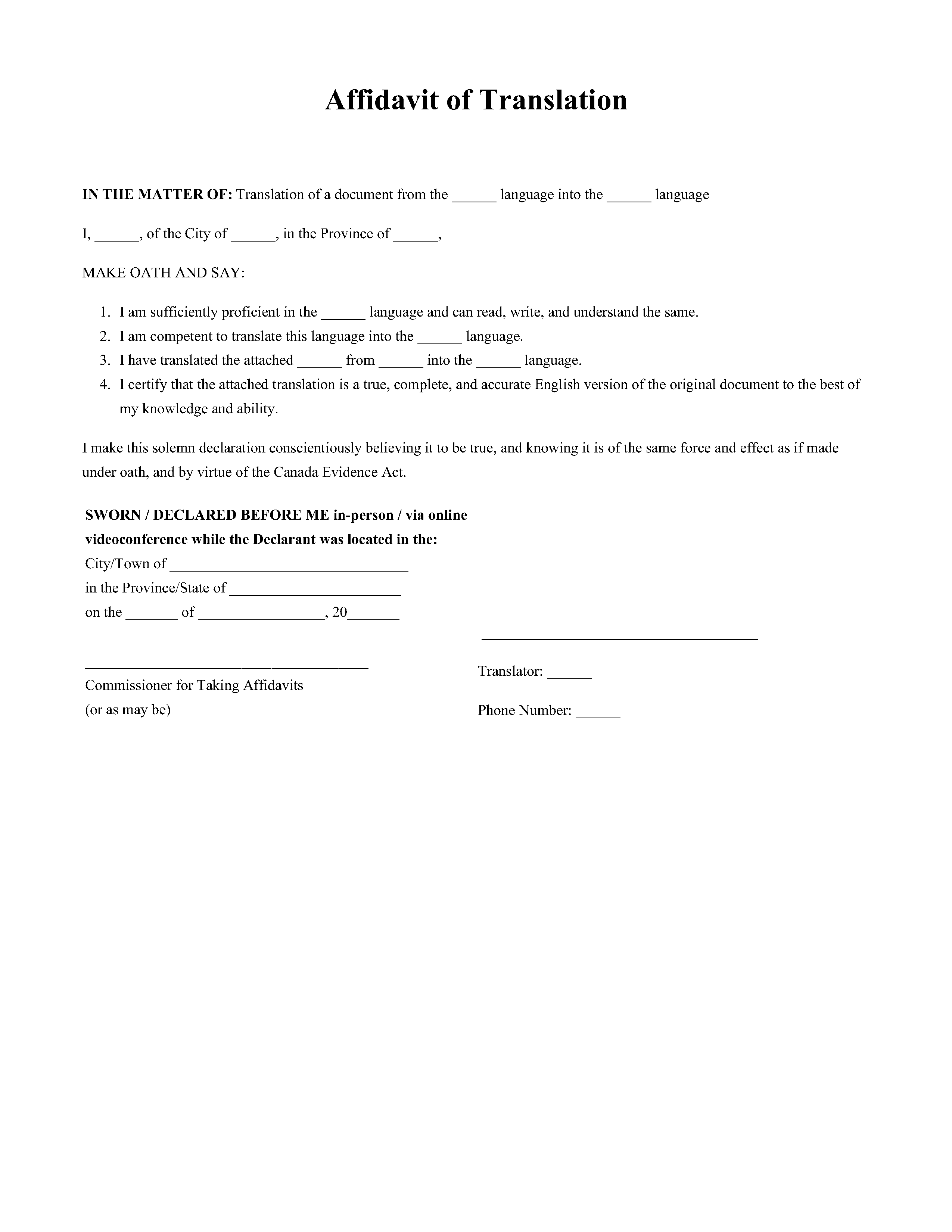 Some Canadian authorities may require you to have this Affidavit commissioned by a Canadian-authorized official, even if completed abroad. It’s best to check with the recipient before commissioning.