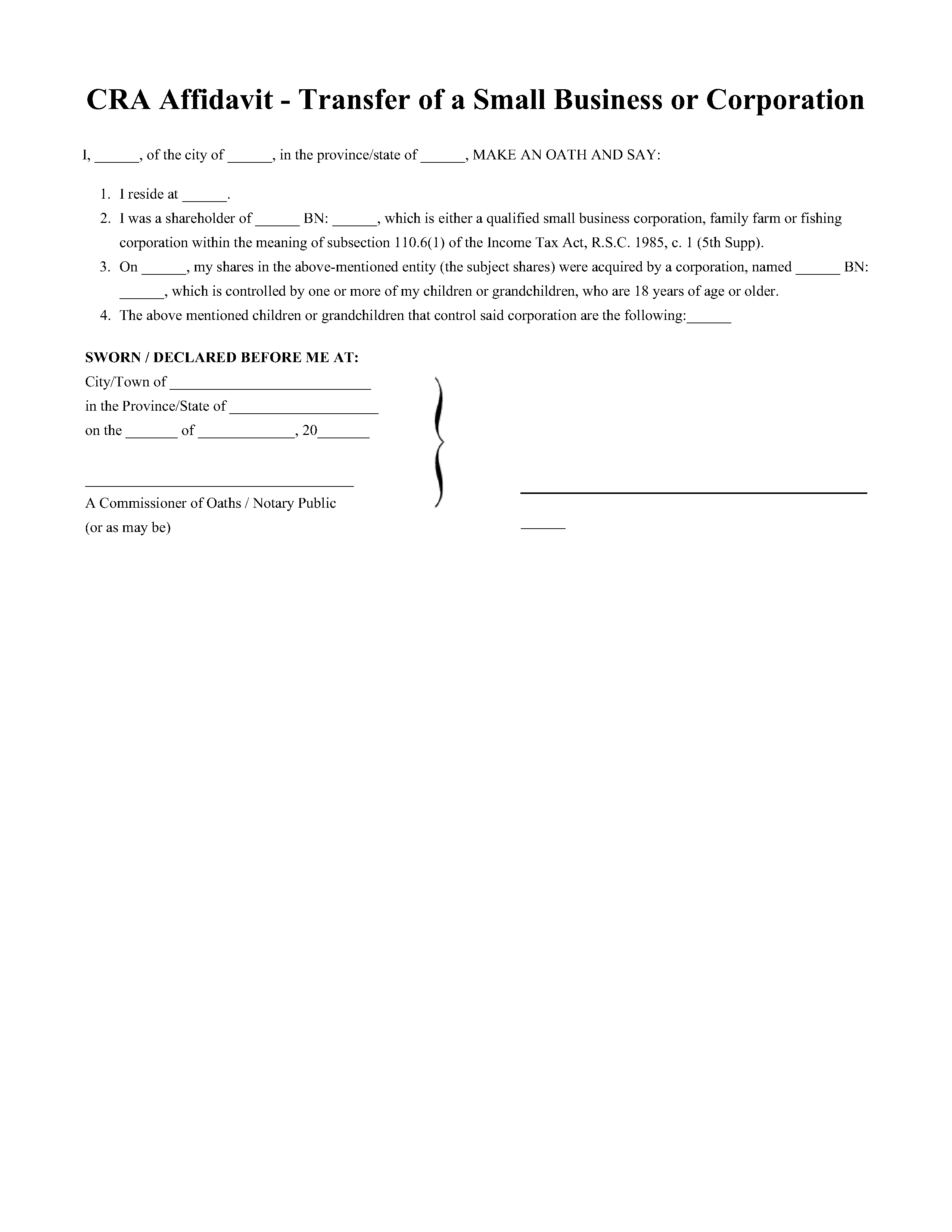 CRA Affidavit - Transfer of a Small Business or Corporation