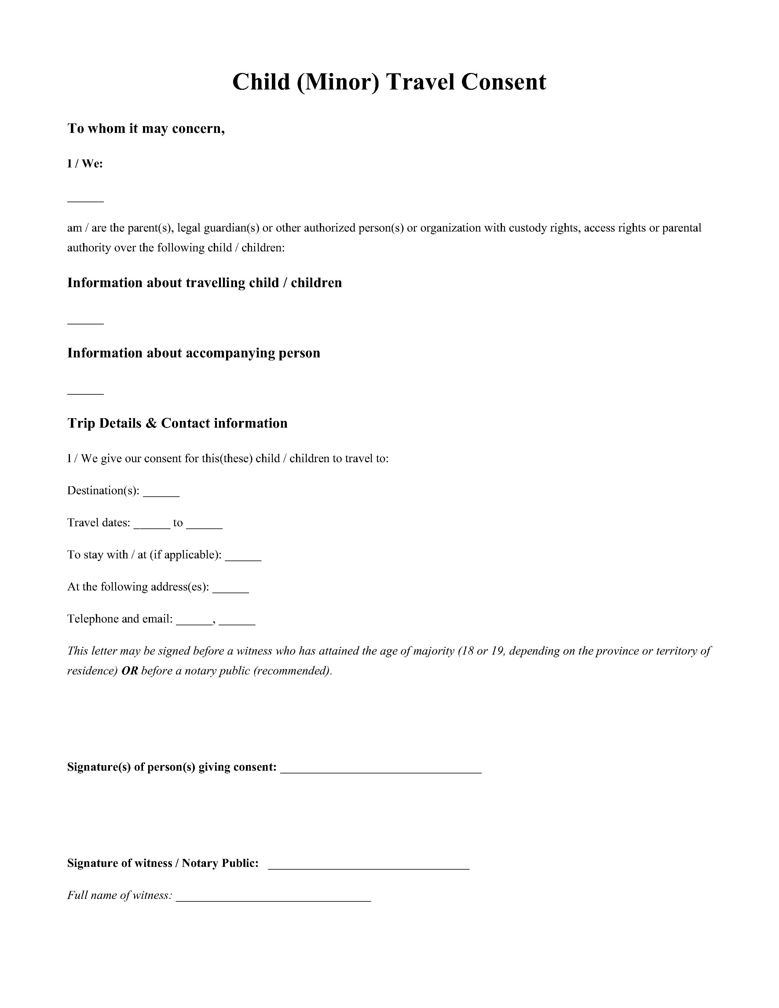 This letter is also sometimes called a Child Travel Consent Form. A minor requires this letter when travelling beyond Canadian borders with: