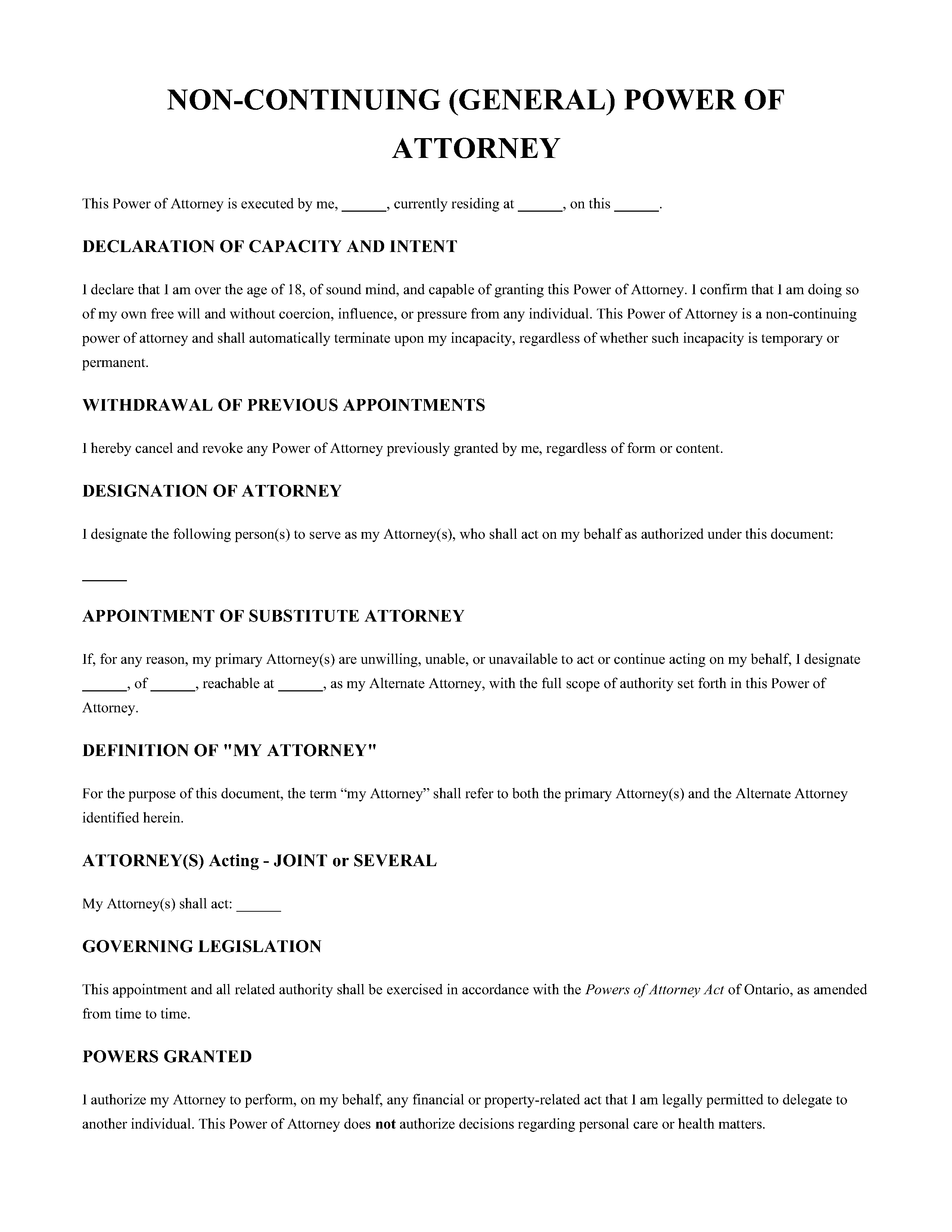 A General (Non-Continuing) Power of Attorney is a legal document that authorizes one or more people to manage your finances and property. In Canada, the individual you appoint is called an “Attorney” — but they don’t need to be a lawyer. The person giving Power of Attorney is called the “grantor”.