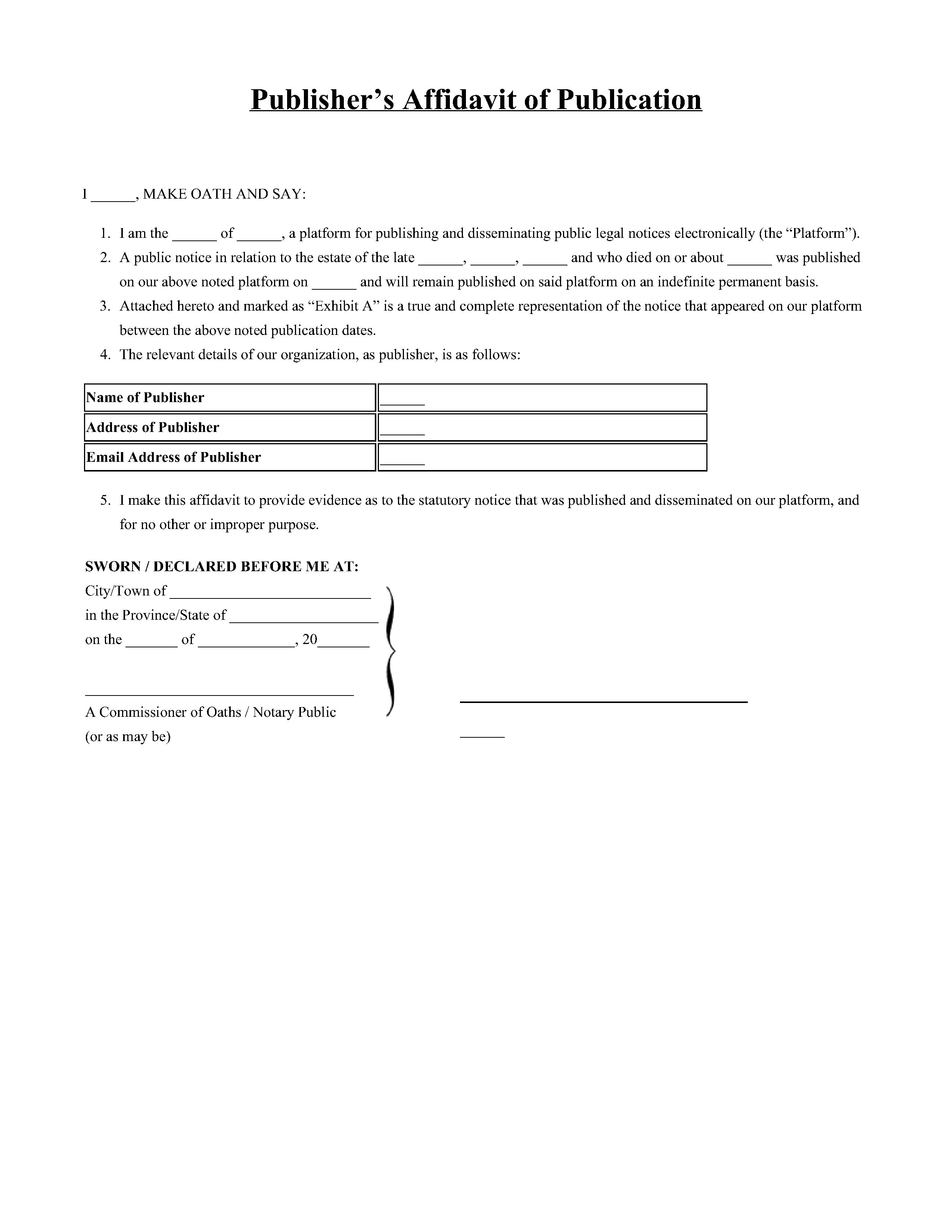 An Affidavit of Publication is typically used for print publications, such as newspapers. That said, some Canadian provinces now accept online publications as fulfilling notice requirements. It’s best to check the requirements of the relevant court, tribunal, or government body requesting proof of publication.