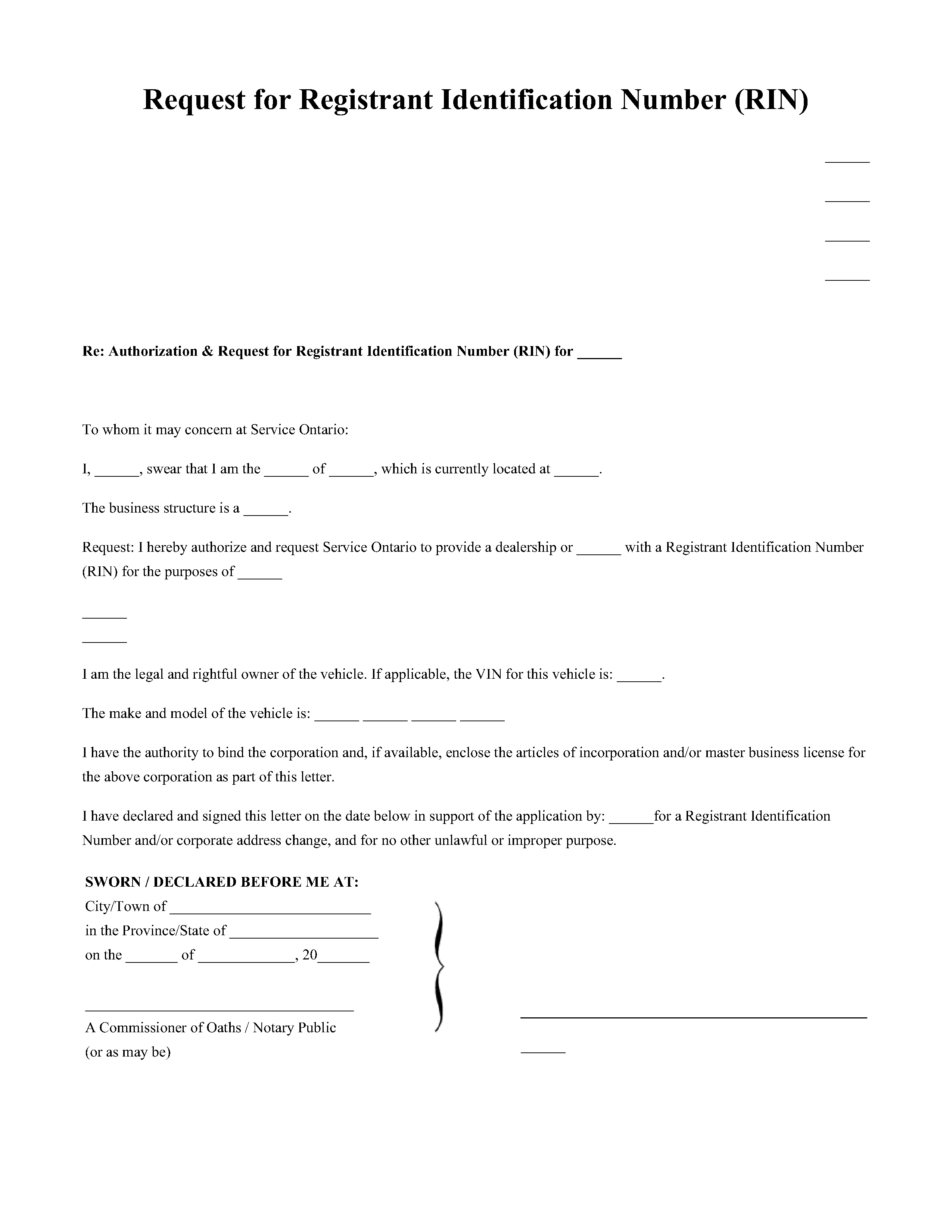 A RIN Letter is a crucial document for any business registering vehicles in Ontario. It’s used to ask the Ministry of Transportation (MTO) to issue a new RIN or update an existing one. Having a properly drafted and commissioned letter ensures your request for a RIN is valid, compliant, and accepted without delay.